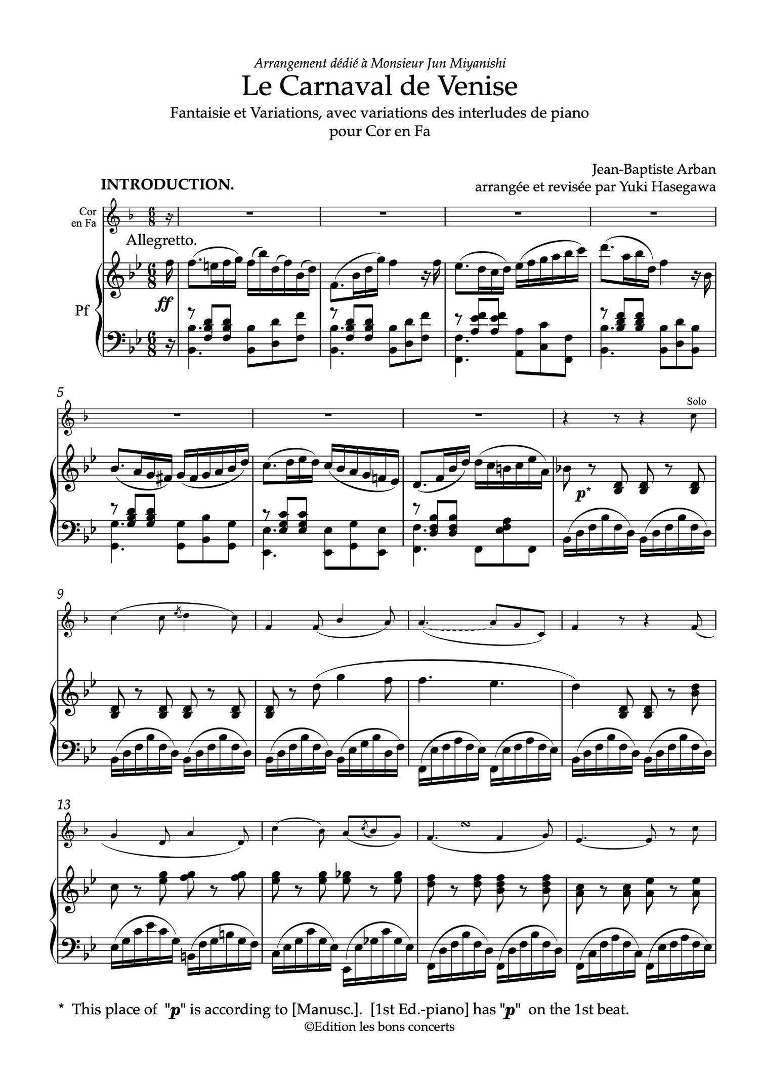 [Horn in F] Arban «The Carnival of Venice» Fantasy and Variations with/without variations of piano interludes by Yuki Hasegawa (sheet music pdf)