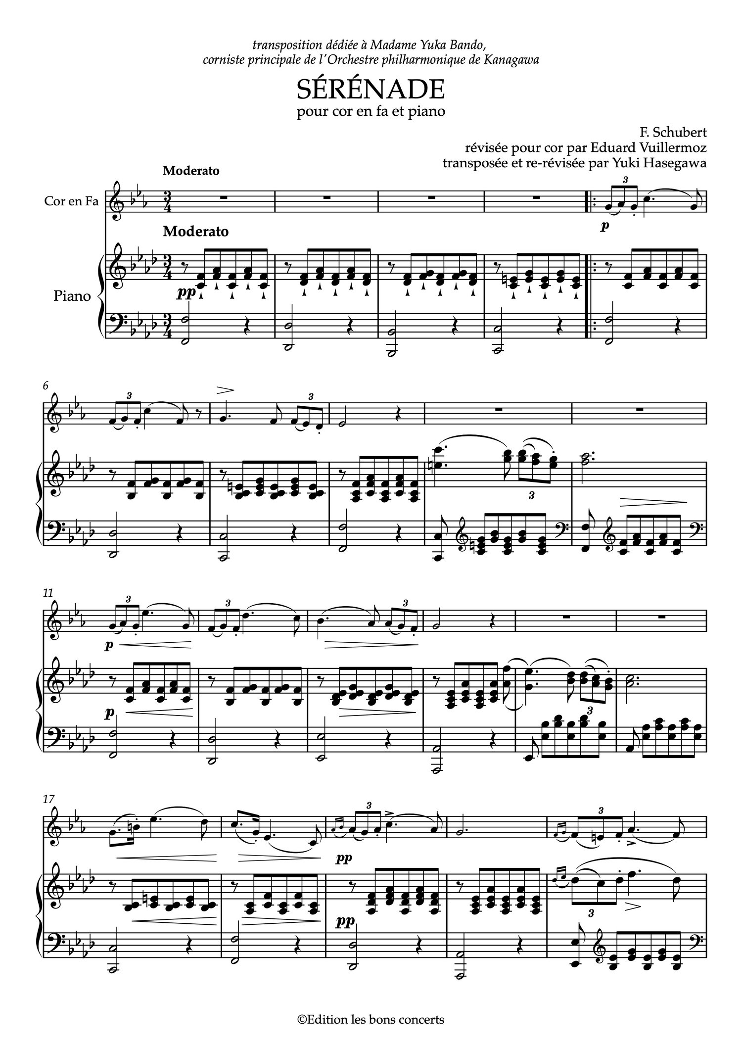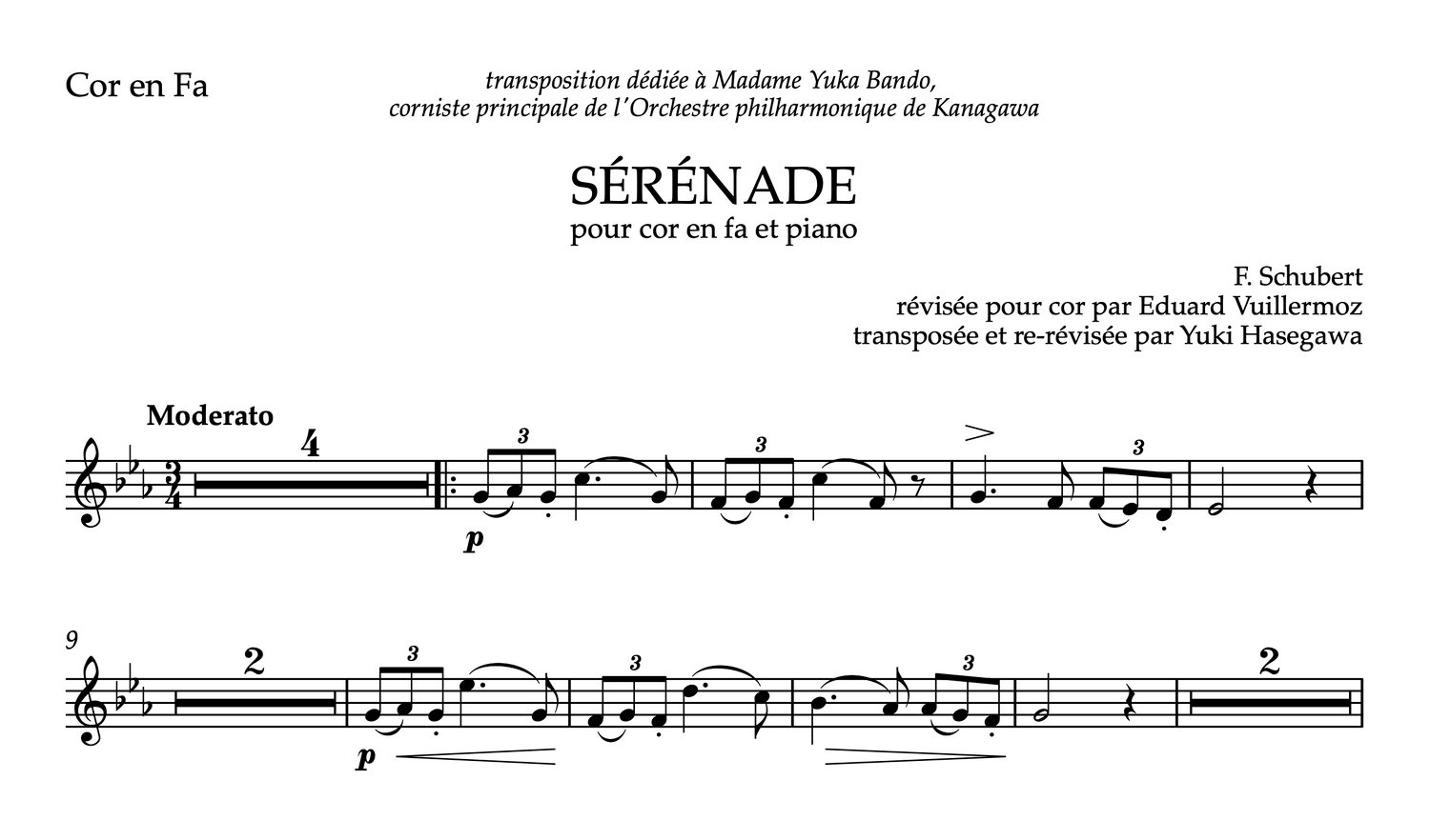 [Horn in F] Schubert: Serenade in F minor ("Ständchen" No. 4 from Schwanengesang D. 957) Revised by E. Vuillermoz, Transposed and Re-revised by Yuki Hasegawa (sheet music pdf)
